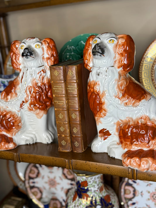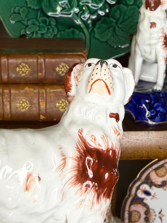 Antique Staffordshire Spaniel Dogs | Red & White Mantel Pair | 10” Tall