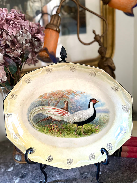 Antique Limoges Pheasant Platter, 12 Sided French Porcelain with Pearlescent Cartouche