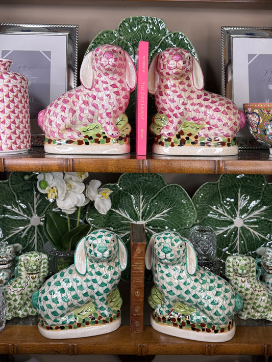 Danny's Fine Porcelain: Staffordshire Bunny Hare Pair in Green Fishnet – Hand-Painted Porcelain with Gold Detail, 8Lx4Wx8.5H" #41430