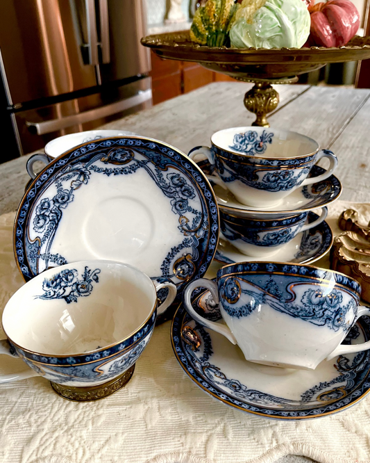 Romantic Set of 6/19th Century Royal Staffordshire “Reknown” Flow Blue Gilded Broth Cups and Saucers