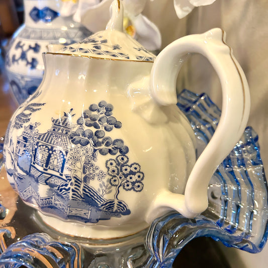 Danny's Fine Porcelain - Blue & White Willow, Bronze Dragonfly Footed Tray 10x7”
