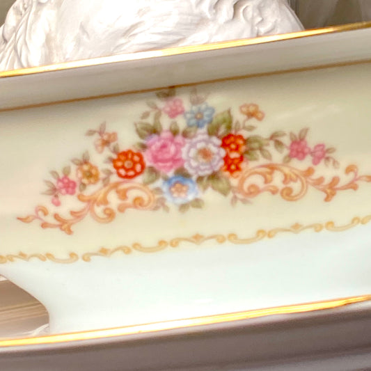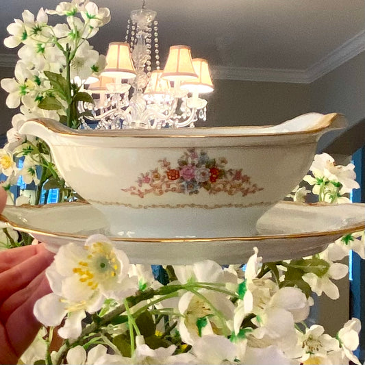 Charming vintage pink willow gravy syrup boat with attached under plate.