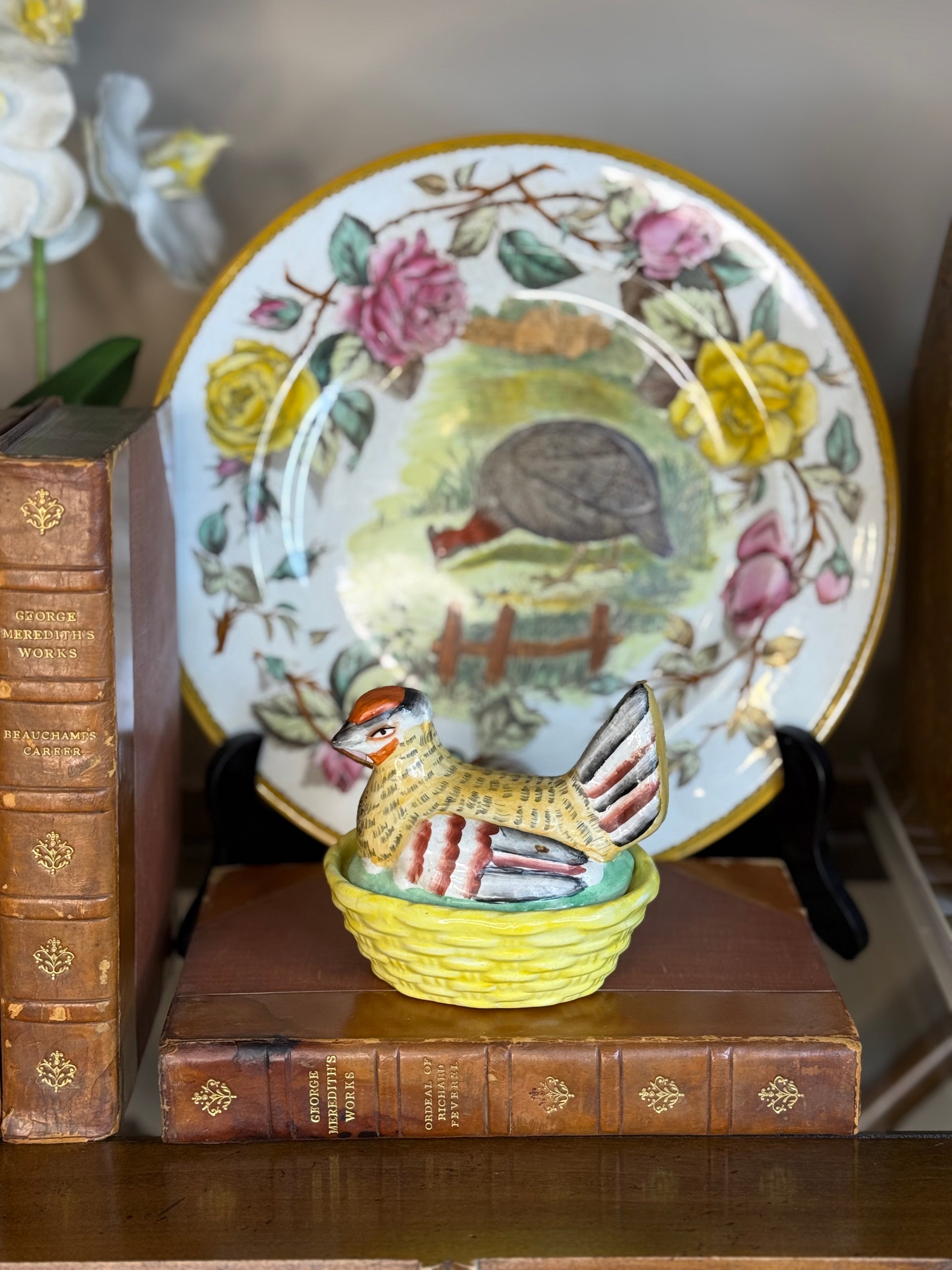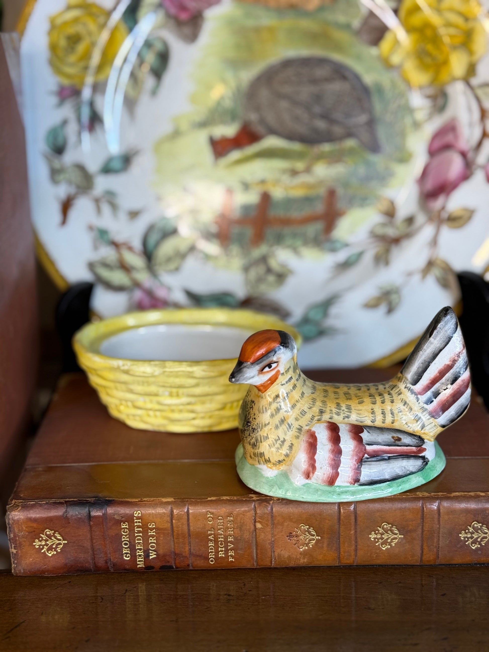 The nest base features a basketweave texture glazed in sunny yellow, while the bird’s expressive form and painted feather detailing give the piece wonderful personality. Marked to the underside “Staffordshire Ware – England,” confirming its English origin.