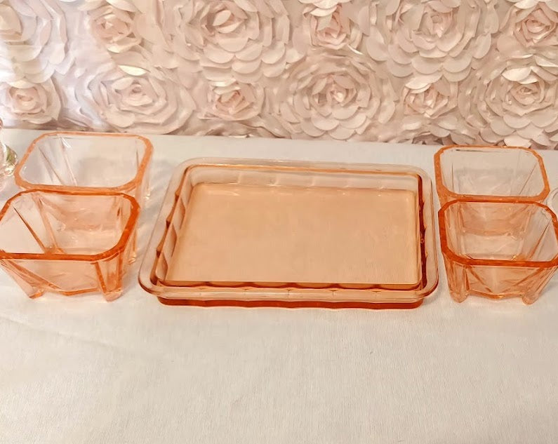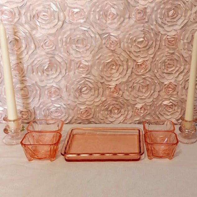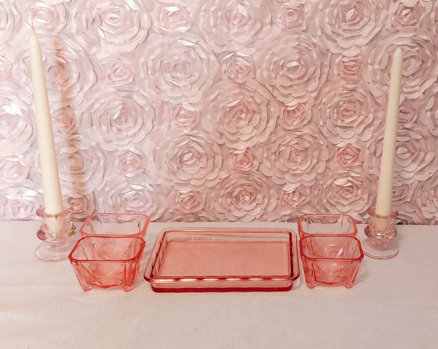 Add some elegance to your dining table with our Pink Set of Cambridge Nut candy cup bowls with Tray Or Condiments holder. This 5 piece set is not only in excellent condition, but also a rare find. Perfect for serving nuts, candies, or condiments, it's sure to impress your guests.