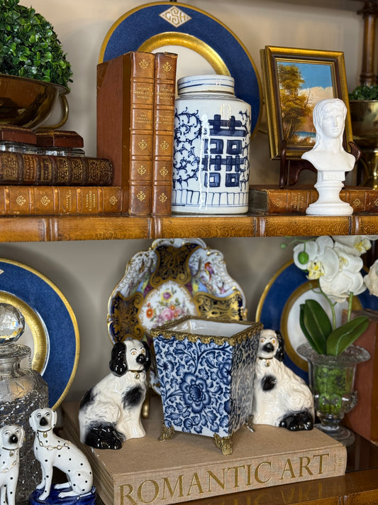 Danny’s Fine Porcelain Blue & White Spaniel Dog Figure Pair W/ Gold Accent (2 sizes to choose).