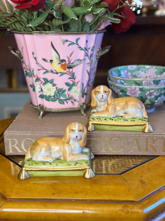 DANNY'S FINE PORCELAIN: 5x4x4 Ceramic Spaniel/Dog Bookends, Lime Gold Pillows