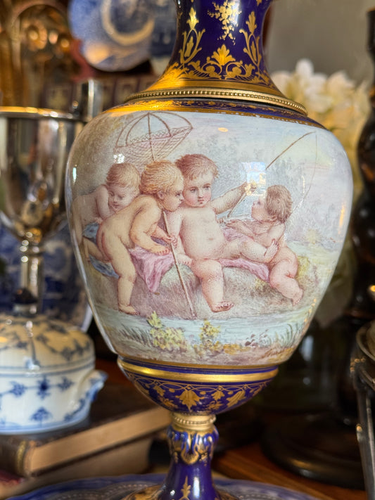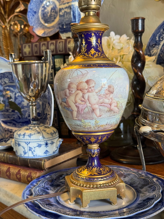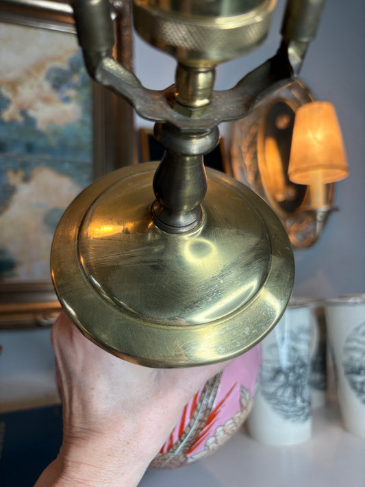 Sophisticated Mid Century Hand Painted Chinoiserie Porcelain Lamp Ornate Brass Base