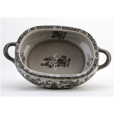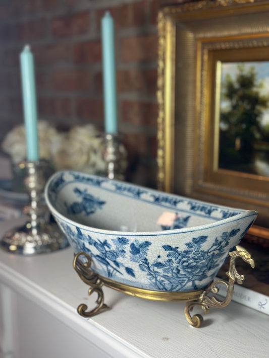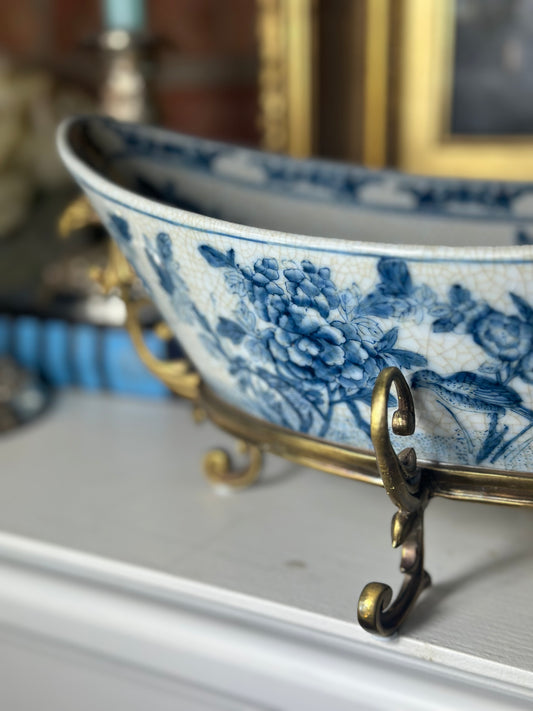 Danny's Fine Porcelain - Blue & White Pagoda Willow, Bronze Footed Trinket/Soap Dish, 8x4.5"