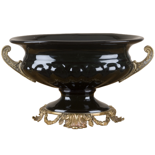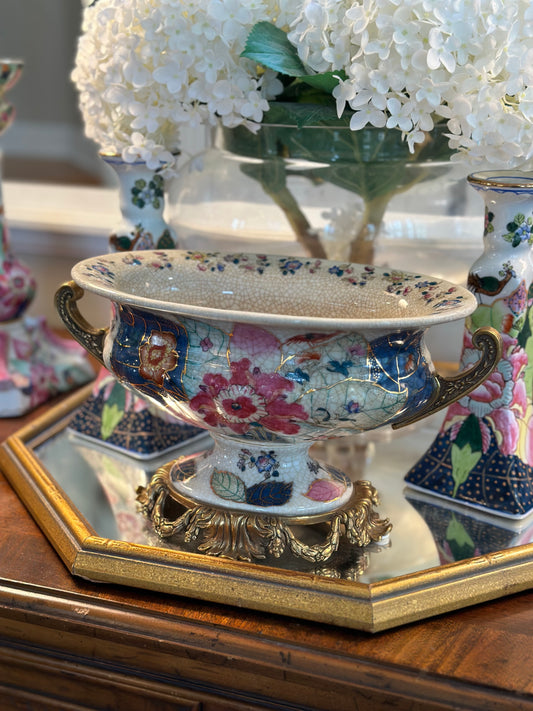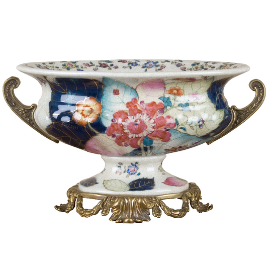 Danny's Fine Porcelain - Pink & White Porcelain "Prim rose" Basin/Planter, Bronze Detailing, 22x11"