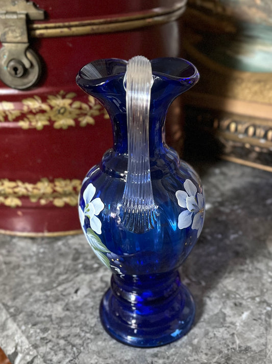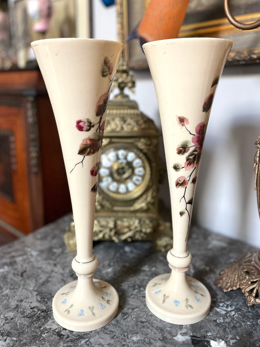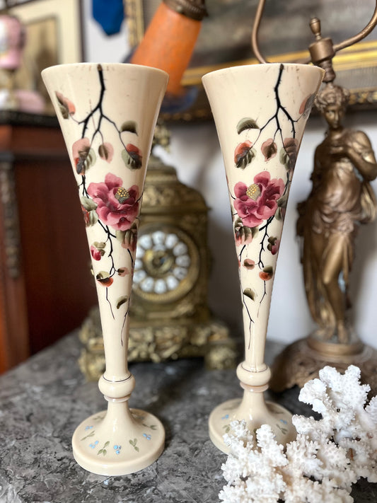 Unique Pair Of Hand Painted Bristol Glass Vases With Left/Right Hands And Flowers 9”