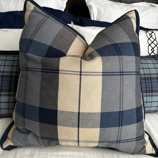 Set of three traditional plaid throw pillows.