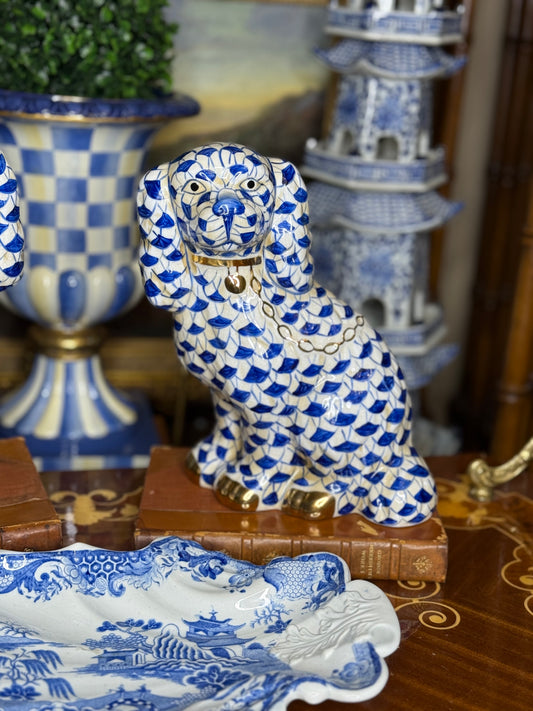 Danny’s Fine Porcelain: Large 16Lx3.5Wx9H Blue & White Spaniel Dog Figure Pair W/ Gold Accent