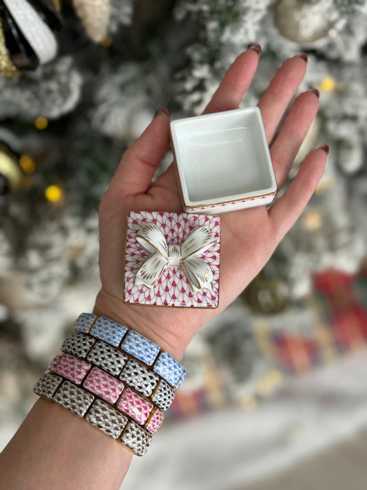 Herend Fishnet hand-painted porcelain with 24K gold: Box with Bow - 2” L × 1.75” H,