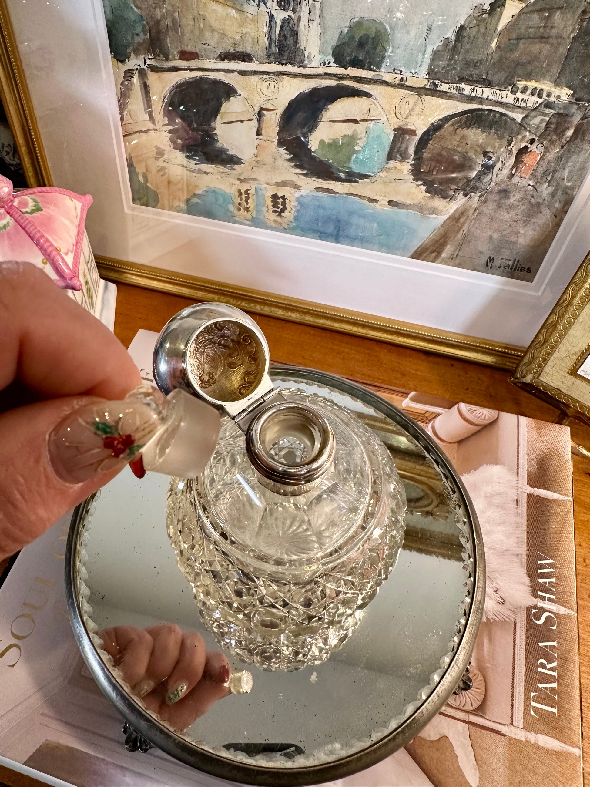 Victorian Art Nouveau Cut Crystal Perfume Bottle with Sterling Silver Repoussé Top Birmingham, England, c. 1901, 5”