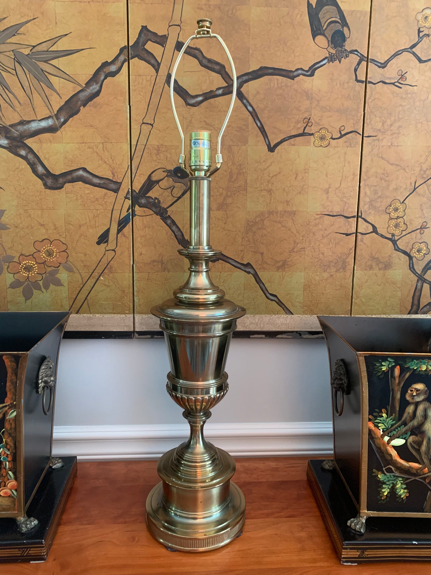 This remarkable Vintage Brass Stiffel Trophy Lamp (no shade) is 31.5” tall and a generous 21” in diameter at the base. It's in perfect working condition, wired for a 3-way bulb, and proudly displays the Stiffel Sticker for authenticity. This is a great, Classic lamp that will stand the test of time and blends seamlessly with many decor styles.
