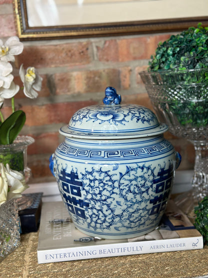 Blue & White Double Porcelain Happiness Lidded Jar, 10" Tall