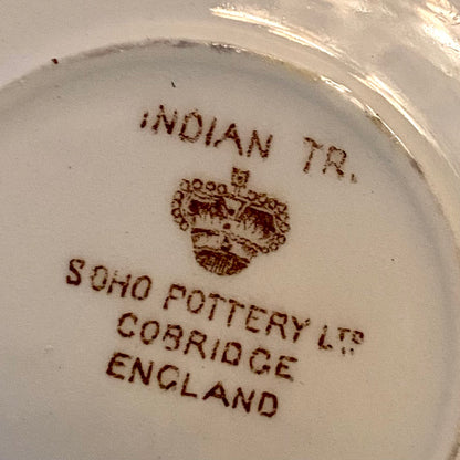This older vintage Indian tree trinket dish porcelain saucer features vivid colors, stamped by Soho Pottery England. With a diameter of 6'', it's a great pick for an Indian tree England plate wall or collection with 3 available.