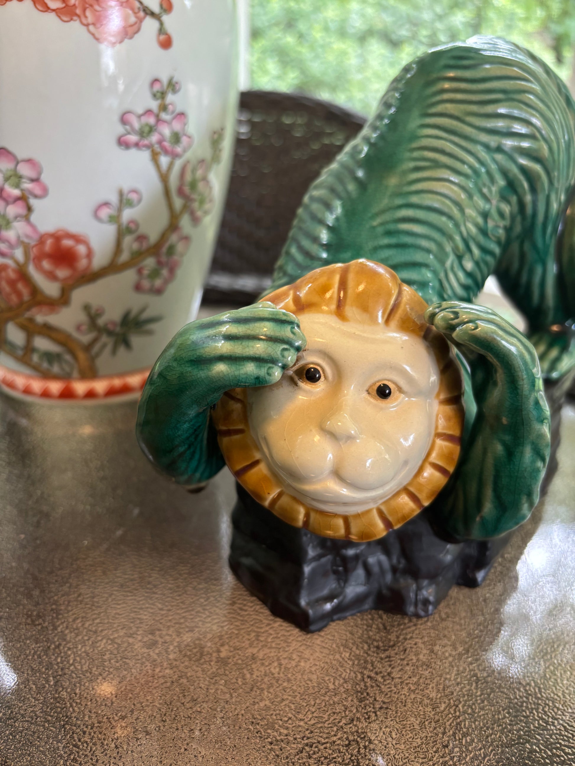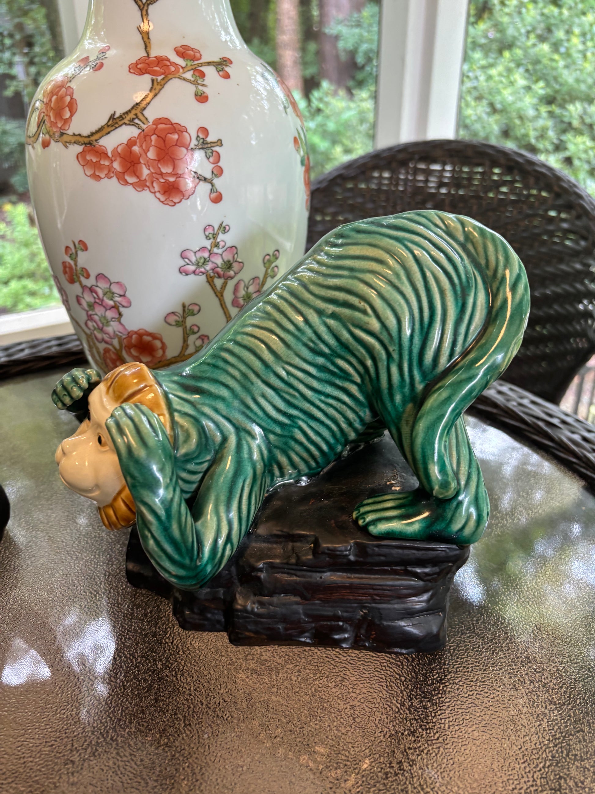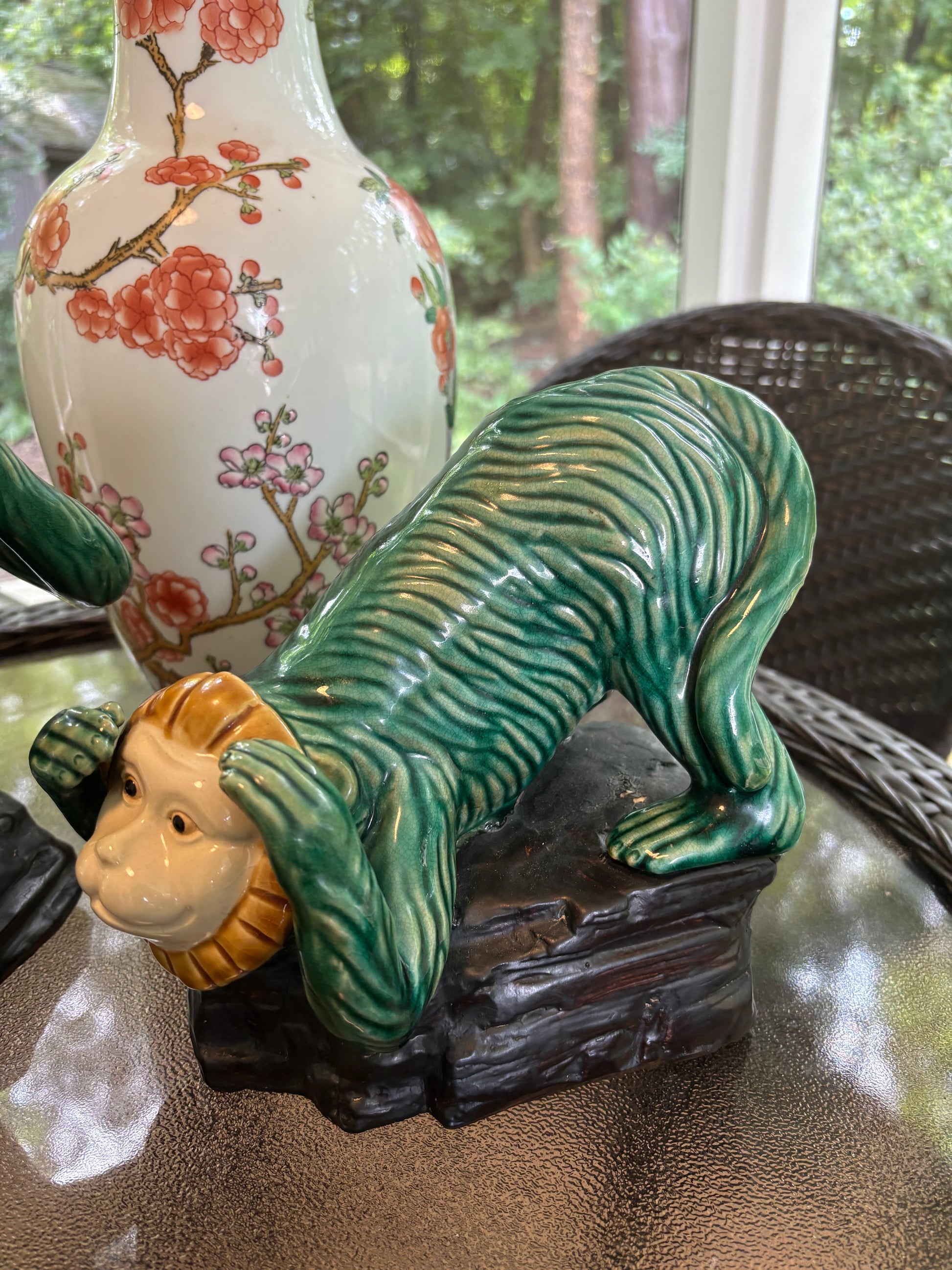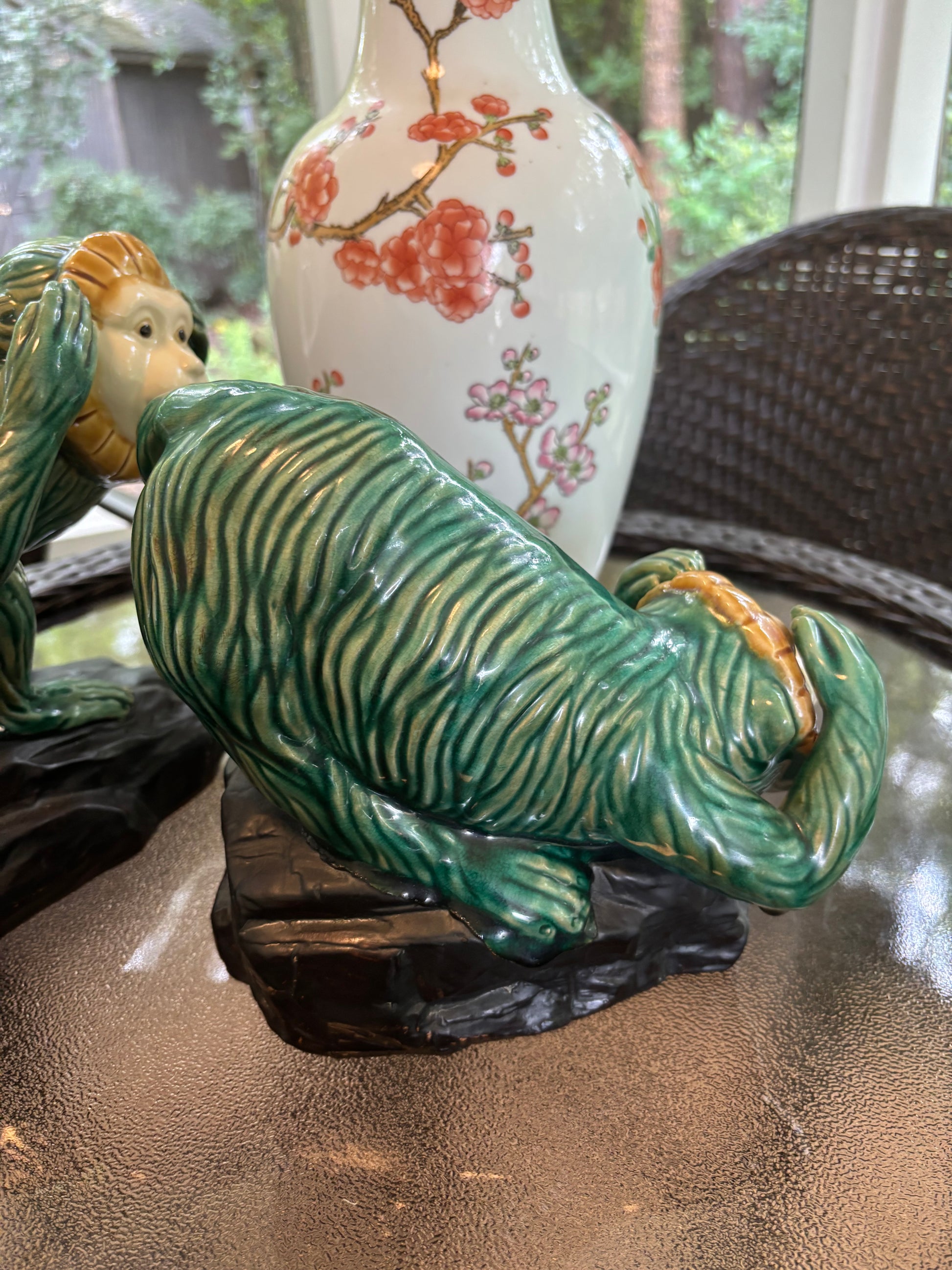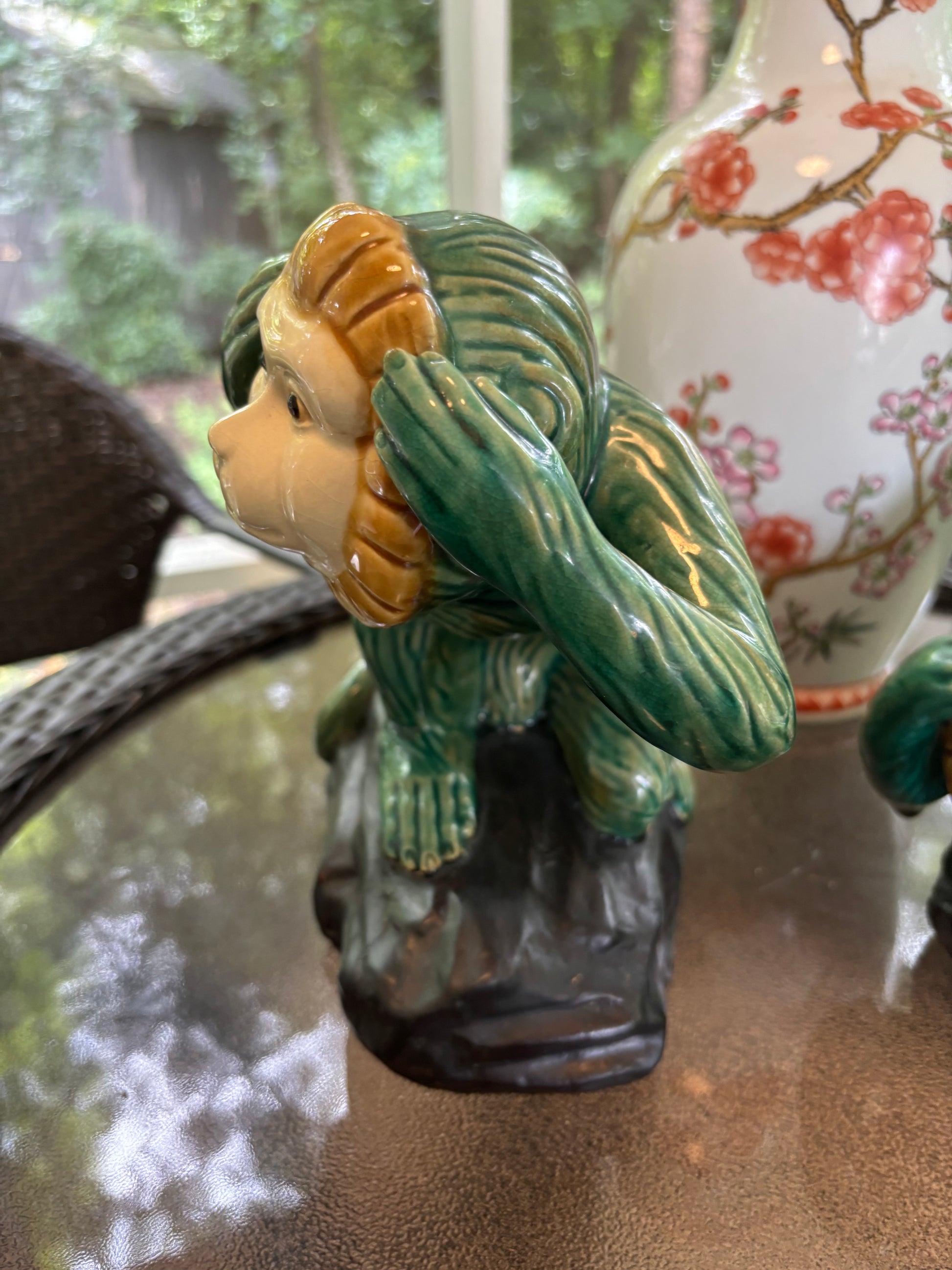 Precious pair of hear no evil, see no evil monkeys! π π These are in beautiful condition! Measures 8 3/4β x 8β and 8β x 9β. Perfect for a shelf or mantle! Tiny peeling of paint under monkey on rock.