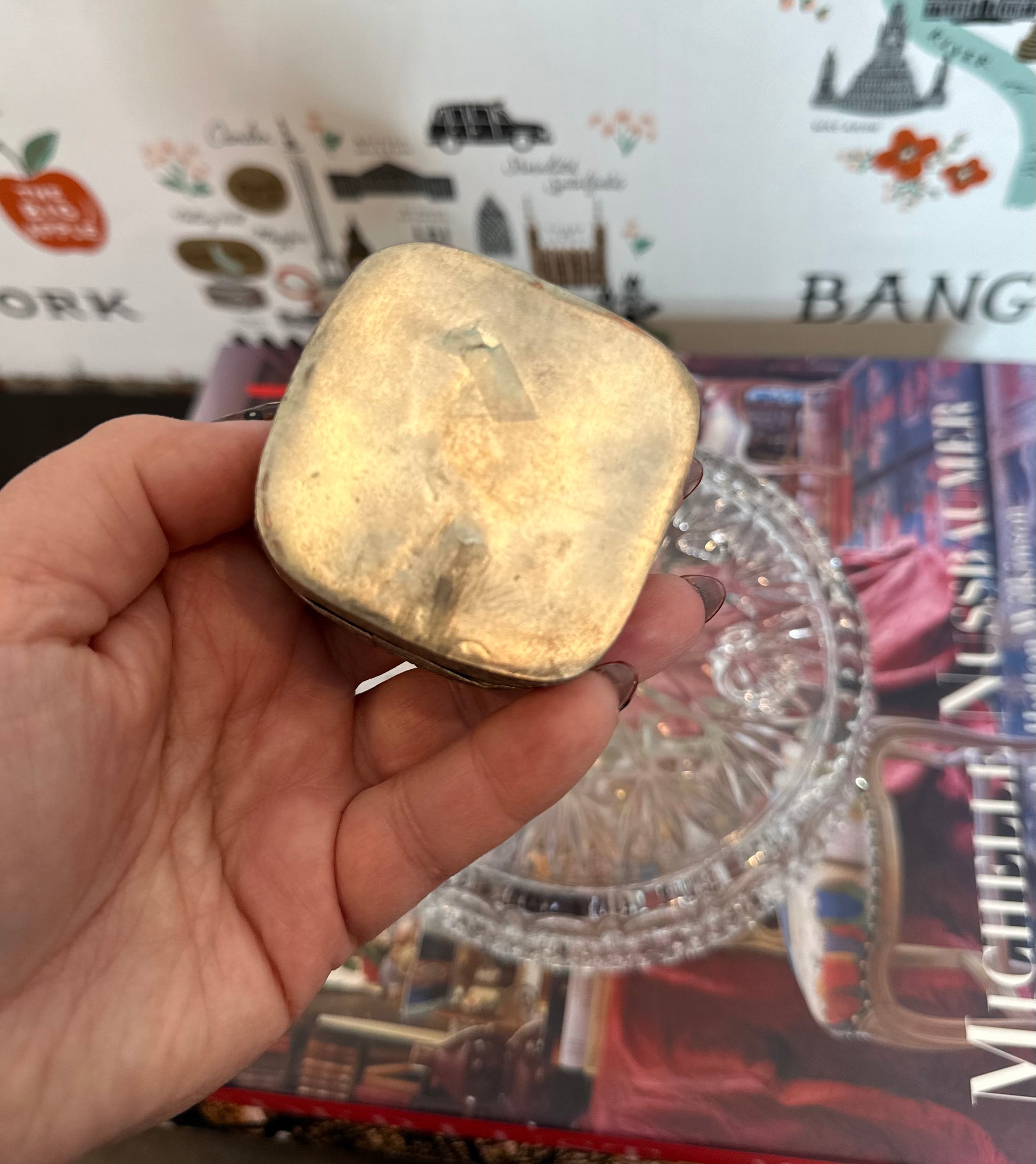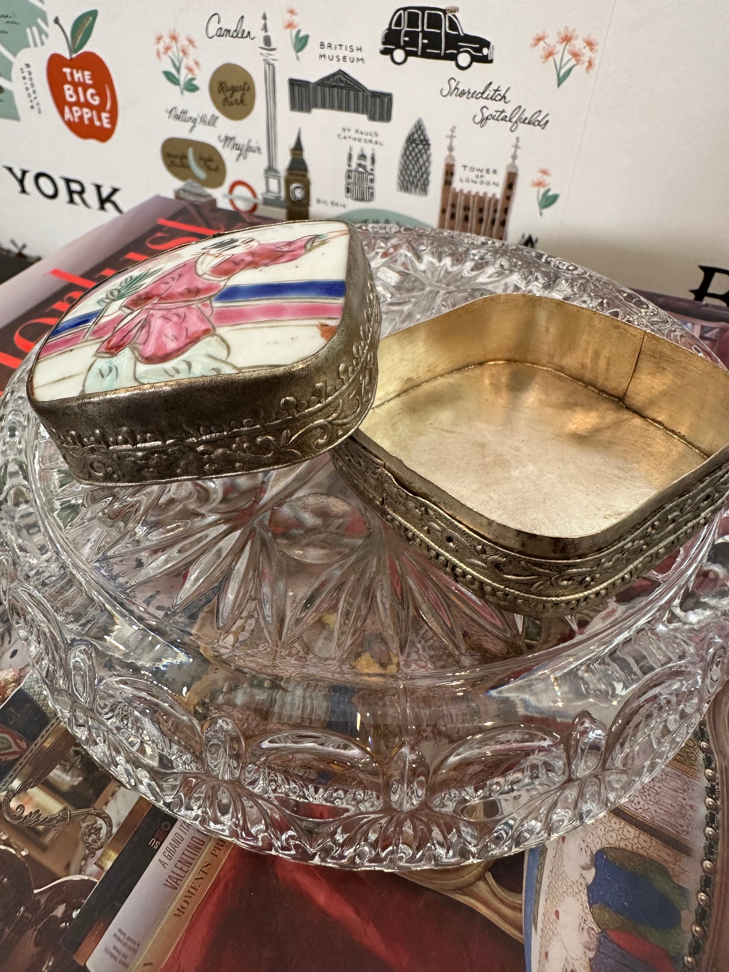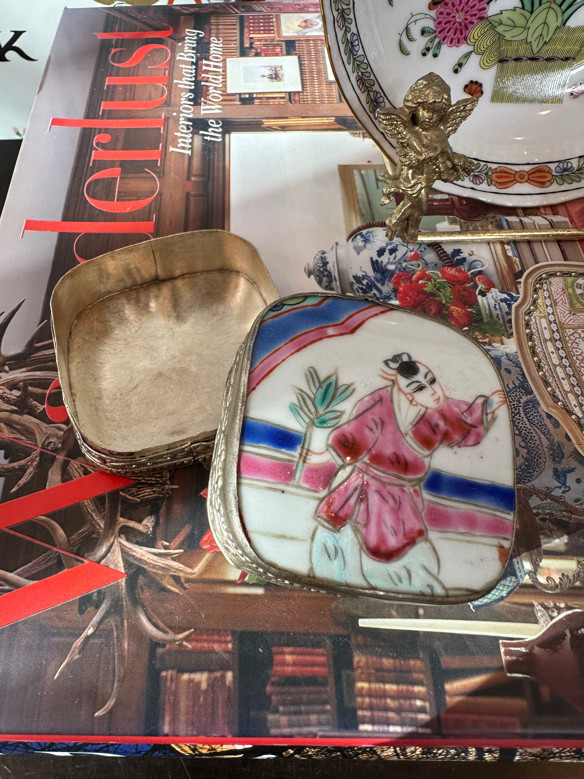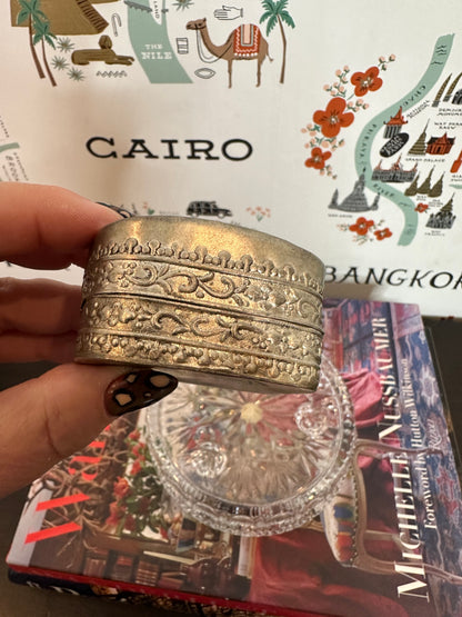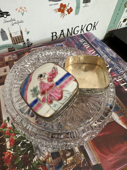 Shard boxes are a wonderful example of repurposing something broken into something useful and beautiful. This small shard box is made of a shard of Famille Rose Medallion porcelain and held together with delicately detailed silver plate. It makes the perfect ring or trinket box and would be great as a stocking stuffer. This piece is excellent vintage condition and measures 2.25" x 2.25" x 1.75" high.