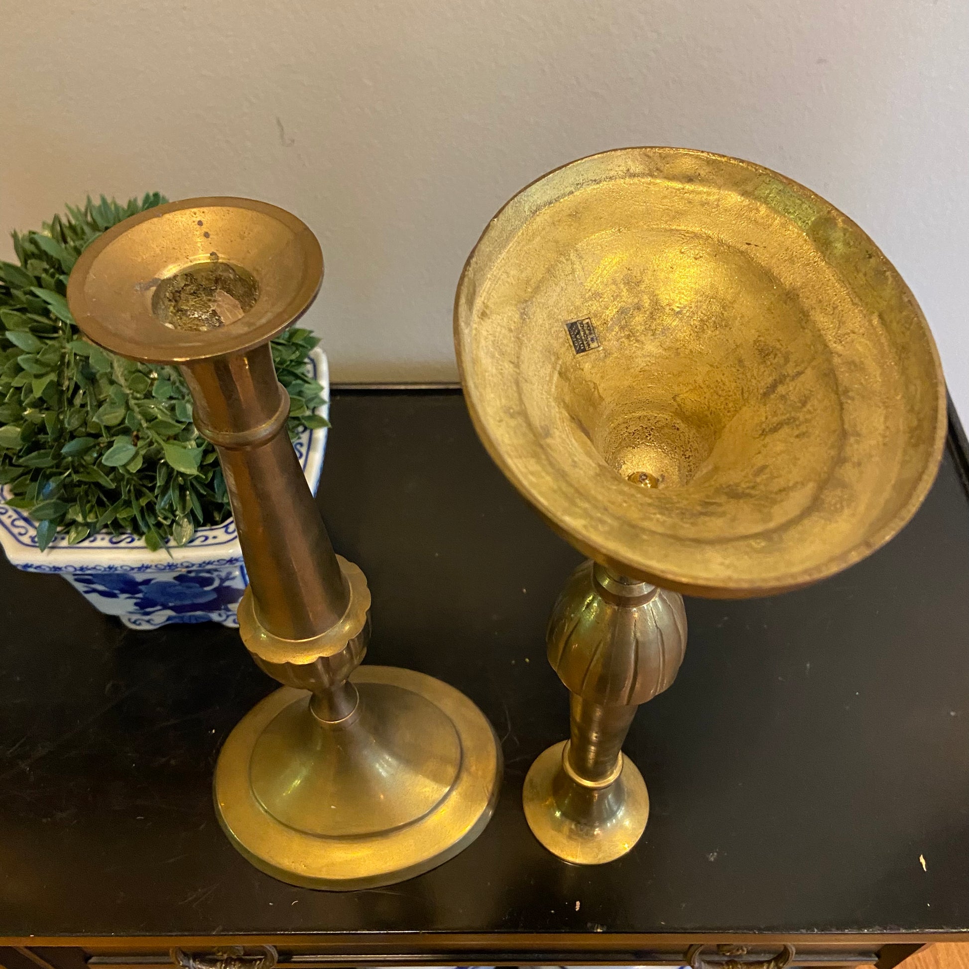 - Statuesque vintage aged brass tall pillar candlestick holders