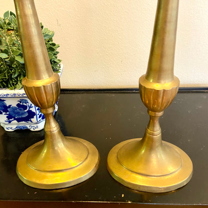 Statuesque vintage aged matte brass tall pillar candlestick holders
