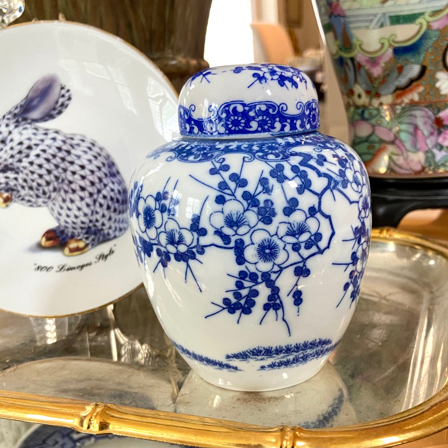 • Vivid vintage blue and white cherry blossom chinoiserie ginger jar