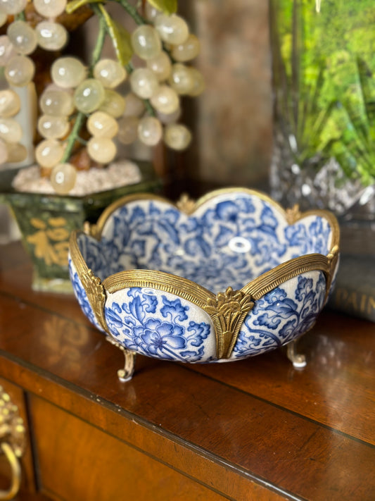 Danny's Fine Porcelain - Stunning Blue & White Floral Bronze Footed Bowl!