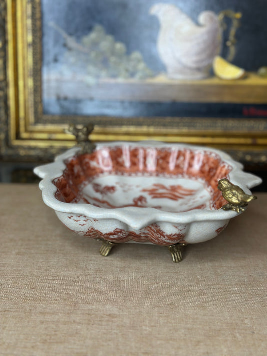Danny's Fine Porcelain - Bronze Rust Porcelain Footed Square Dish, Bird Embellished