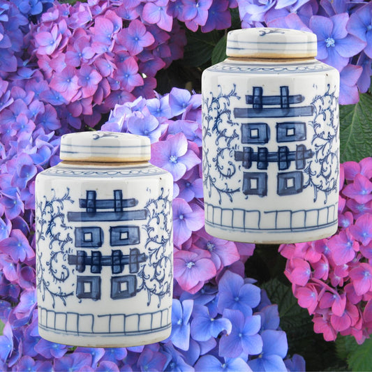 Danny's Fine Porcelain -Blue & White, 7" Tall Double Happiness, Hand Painted Tea Caddy Jar