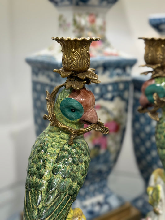 Danny's Fine Porcelain - 14.5” Tall Porcelain Parrot Candlestick Pair with Ormolu Mounts – Chinoiserie Rococo Style