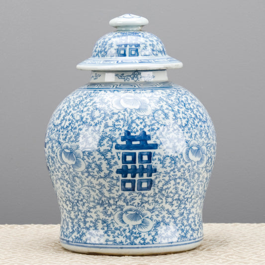 Danny's Fine Porcelain - Blue & White, 12.5" Tall Porcelain Double Happiness Ginger Jar