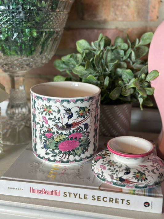 Danny's Fine Porcelain: Pink Floral Footed Basin/ Planter: Birds, Hand Painted, 9x6x7”