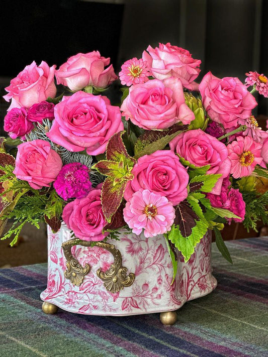 Danny's Fine Porcelain - Pink/White “Prim Rose” Bronze Footed Square Vase Planter - 8.5x6.5"