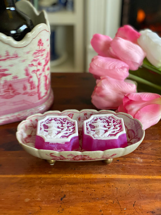 Danny's Fine Porcelain - Pink/White "Primrose" Bronze Footed Trinket/Soap Dish, 8x4.5"
