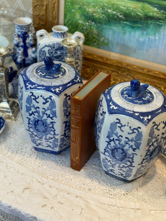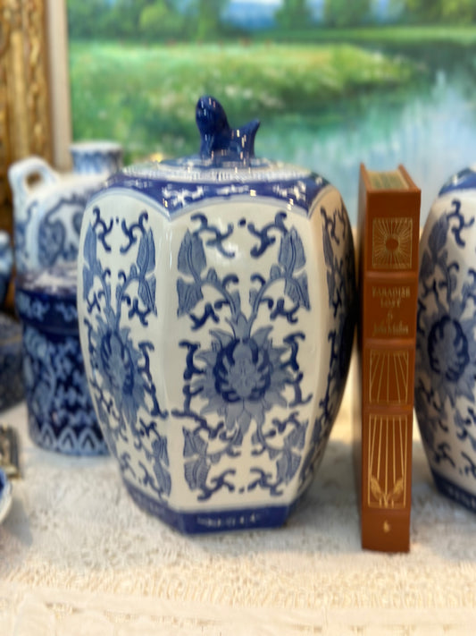 Danny's Fine Porcelain: Blue & White, 7" Tall Double Happiness, Hand Painted Tea Caddy Jar