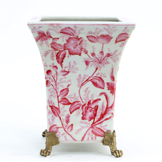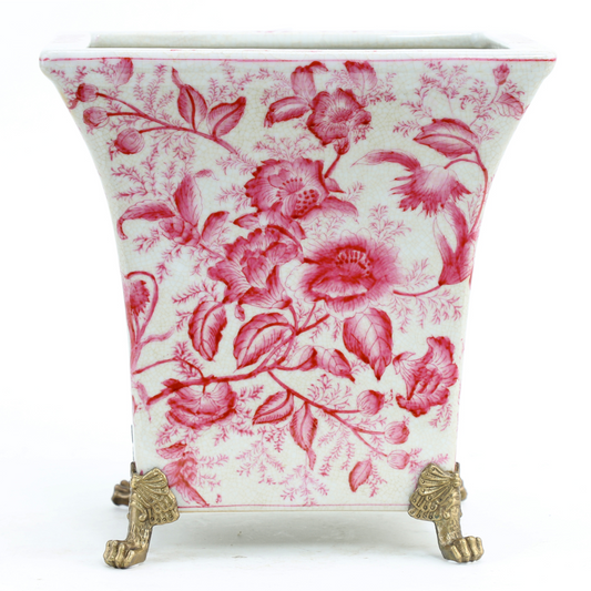 Hand painted Pink & White Pagoda Porcelain Willow Footed Cachepot 6" Tall