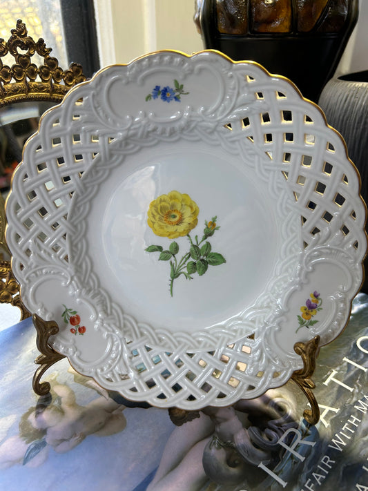 Meissen Reticulated Plate with Hand Painted Rose and Flowers 8 1/2”