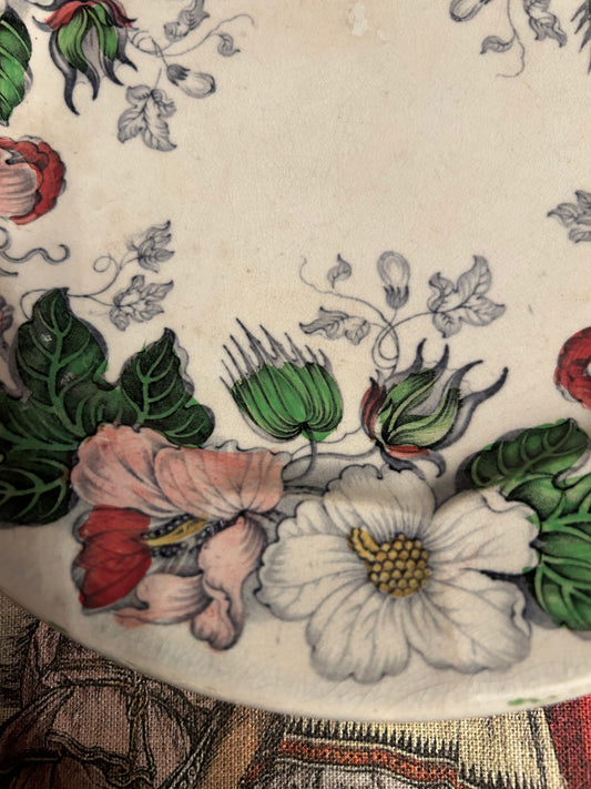 Beautiful Staffordshire Transferware plate with Colorful painting! This plate has an overall glaze stain but it doesn’t mar its beauty!