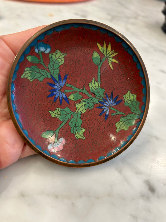 Vintage Chinese Cloisonné 3” Dish with Red Background