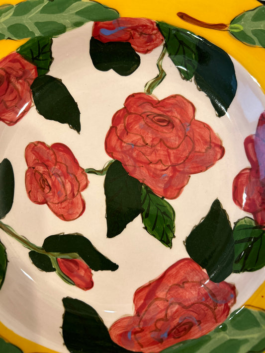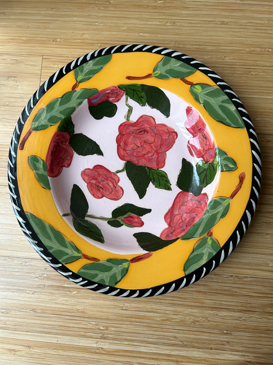 Pink Background Hand Painted Droll Design Deep Dish 12 1/4”