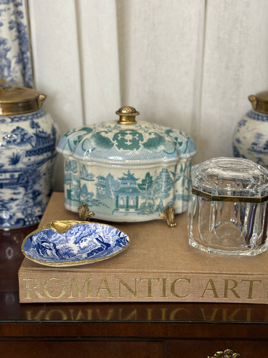 Danny's Fine Porcelain: Blue Willow Lidded Box, Turquoise Chinoiserie with Bronze Feet & Finial