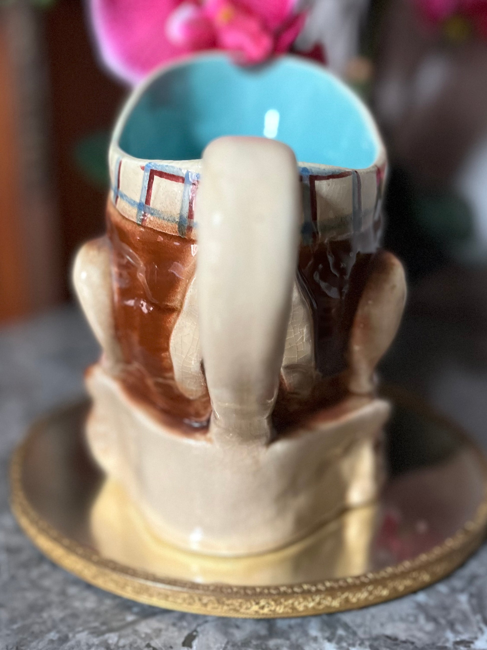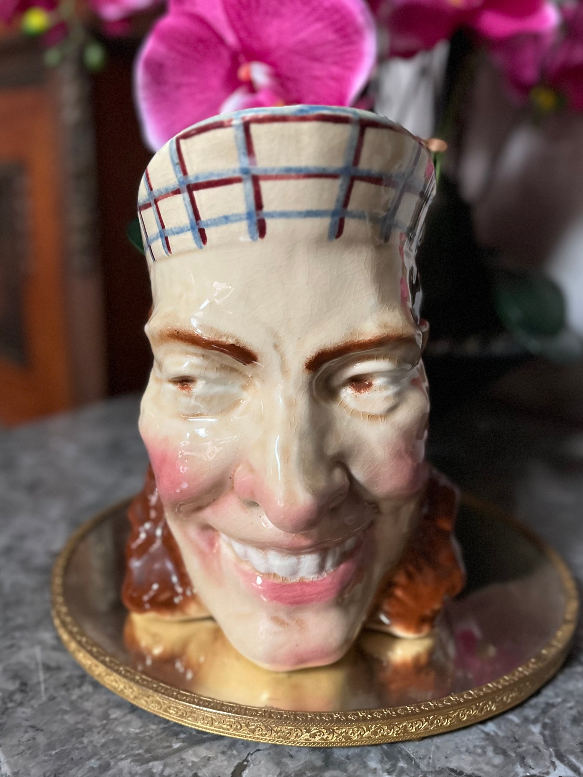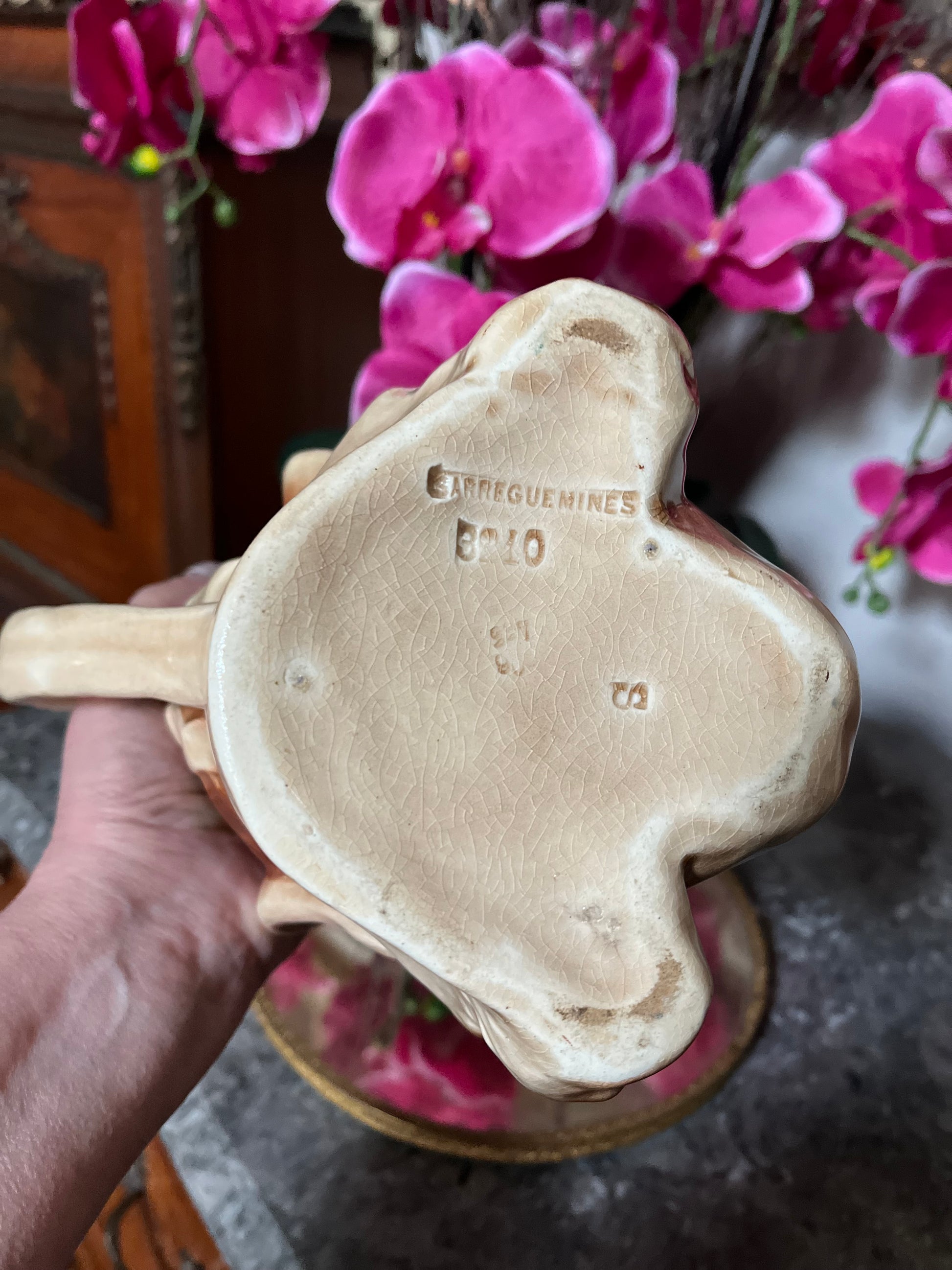 Transport yourself to a bygone era with our Antique French Whimsical Serreguimines Fisherman Jug. With stunning hand-painted colors, beautiful crazing, and a unique design, this jug is sure to be a conversation starter. Add a touch of French nostalgia to your home or delight a loved one with the perfect gift.