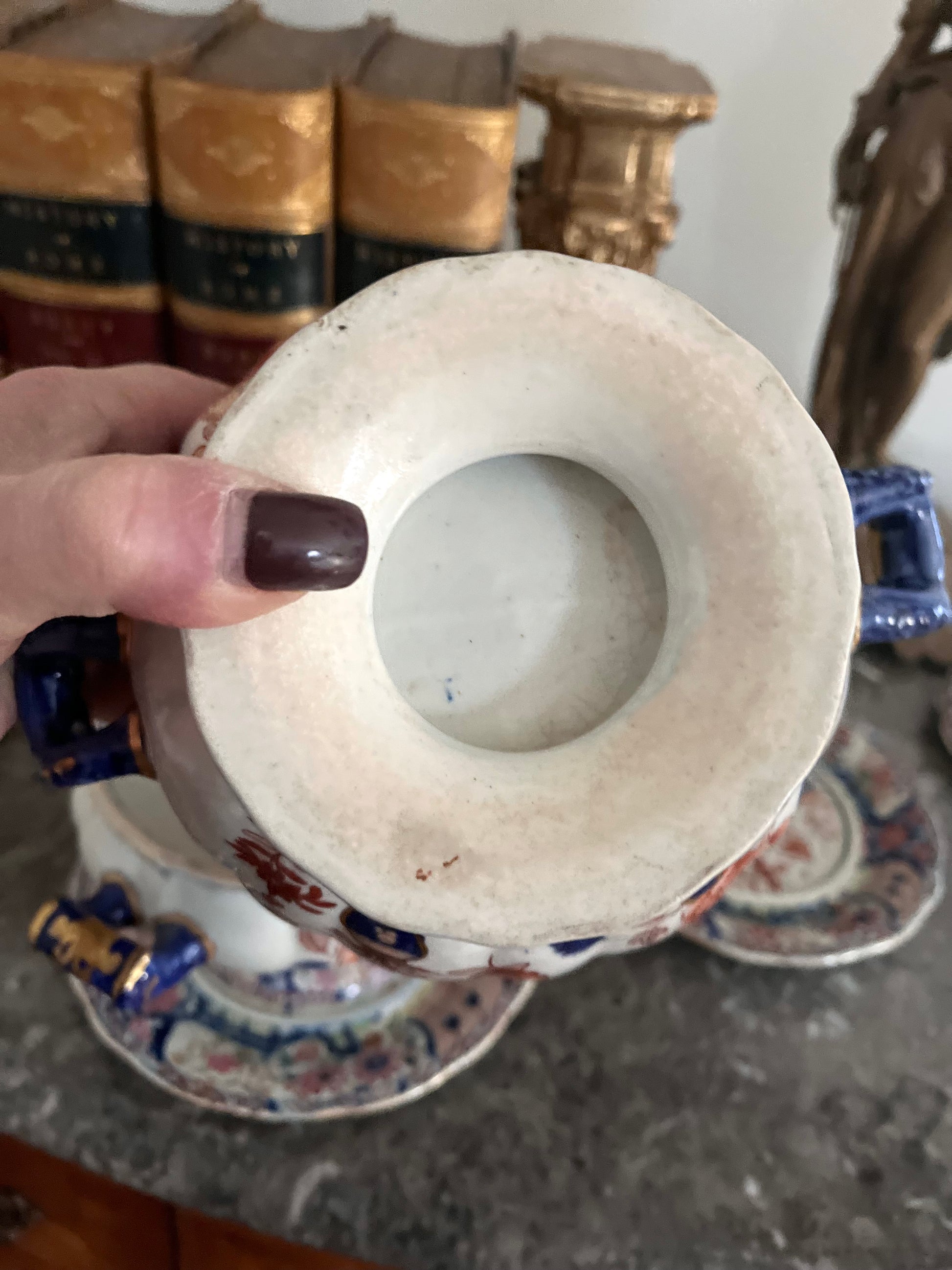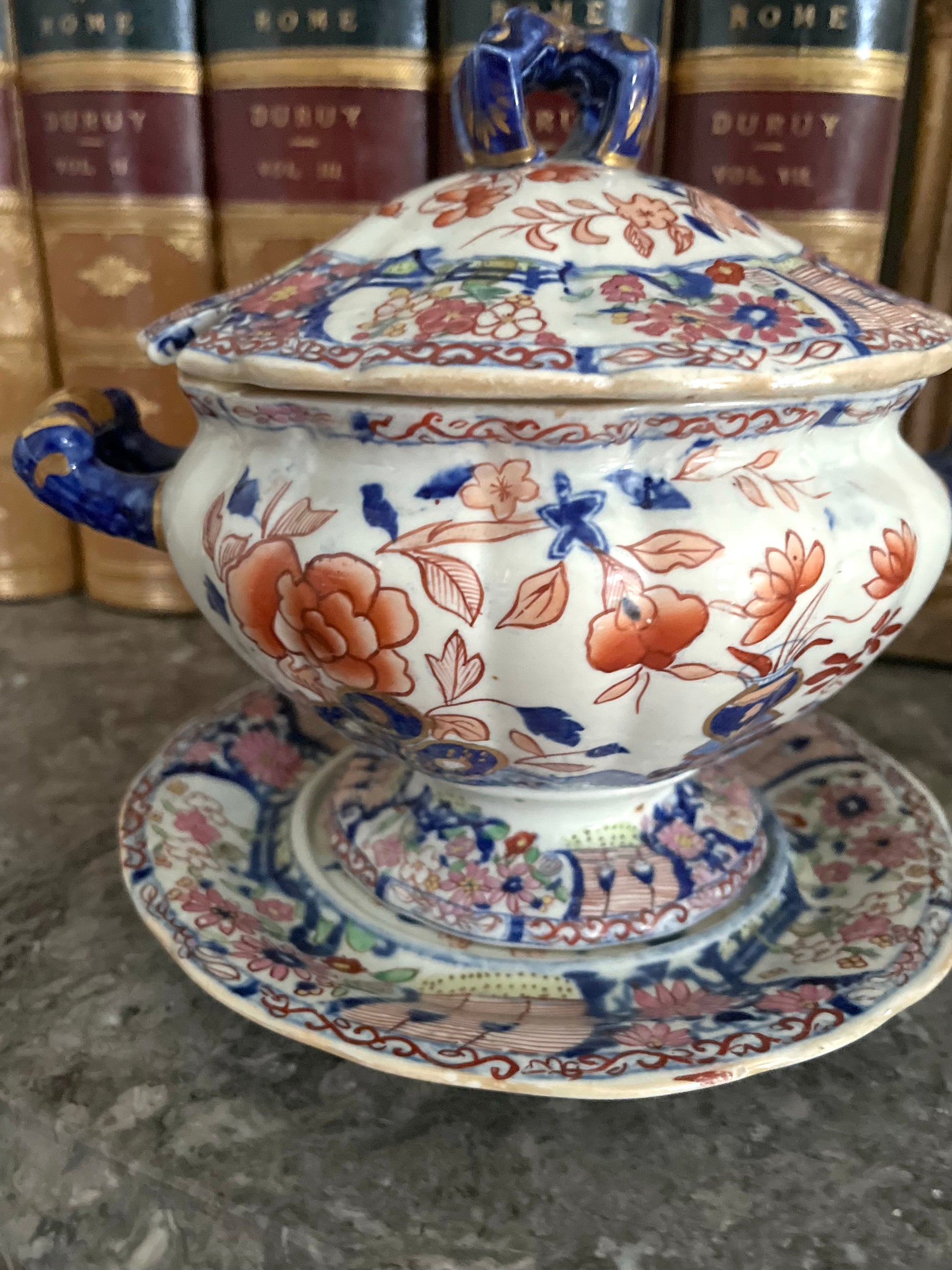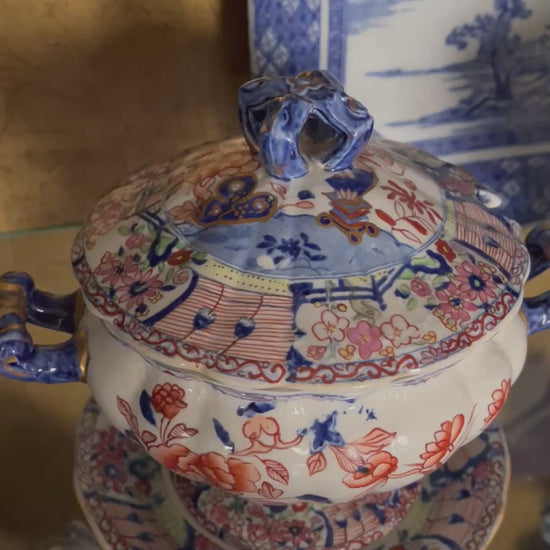Glazed in the classic Mason’s palette of cobalt, iron-red, and hand-painted gilt, the pattern blooms across the domed covers, scalloped handles, and footed forms with remarkable artistry. The knotted handles are sculptural and elegant—true hallmarks of early manufacture—while the underplates echo the design in perfect proportion, creating a complete and visually commanding form.