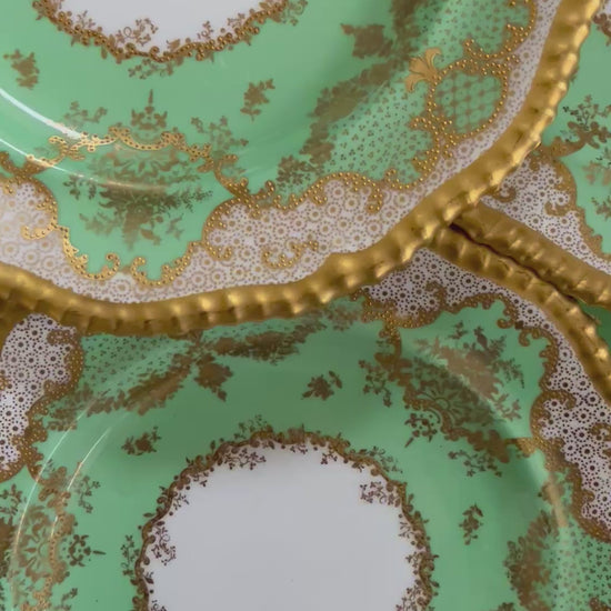 Bring instant grandeur to your table with this breathtaking set of six antique Copeland plates, each showcasing a luminous jade-green ground, ornate raised gilt detailing, and lavish scalloped rims. The intricate lace-border work paired with those rich gold accents makes every plate feel like a miniature masterpiece.