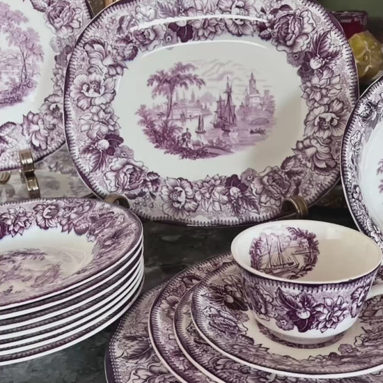 A breathtaking mulberry transferware service inspired by an 1829 Rogers copper engraving and reimagined by A.J. Wilkinson’s Royal Staffordshire potteries 1920-1950’s. The serene waterfront scene, framed by the lush foliate borders the factory became celebrated for, captures everything collectors adore about 19th-century English romanticism.