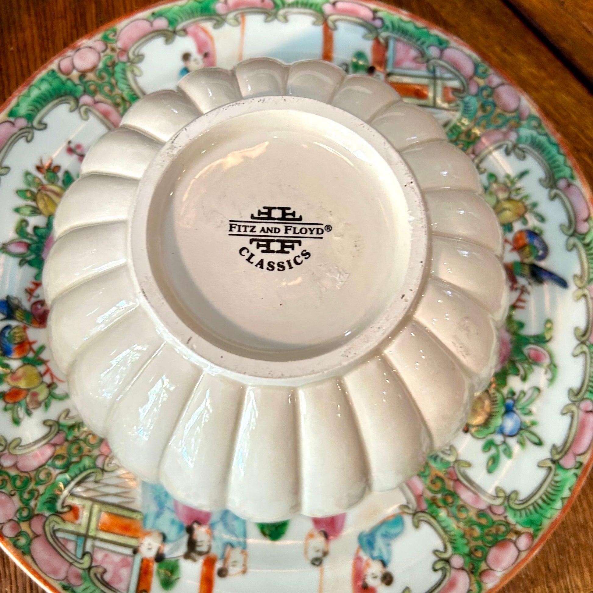 This stunning vintage Fitz & Floyd lidded jar features intricate floral and bamboo designs. It is in excellent condition with no signs of damage such as chips or cracks. The jar measures 6 x 5 inches in size.