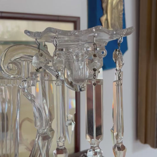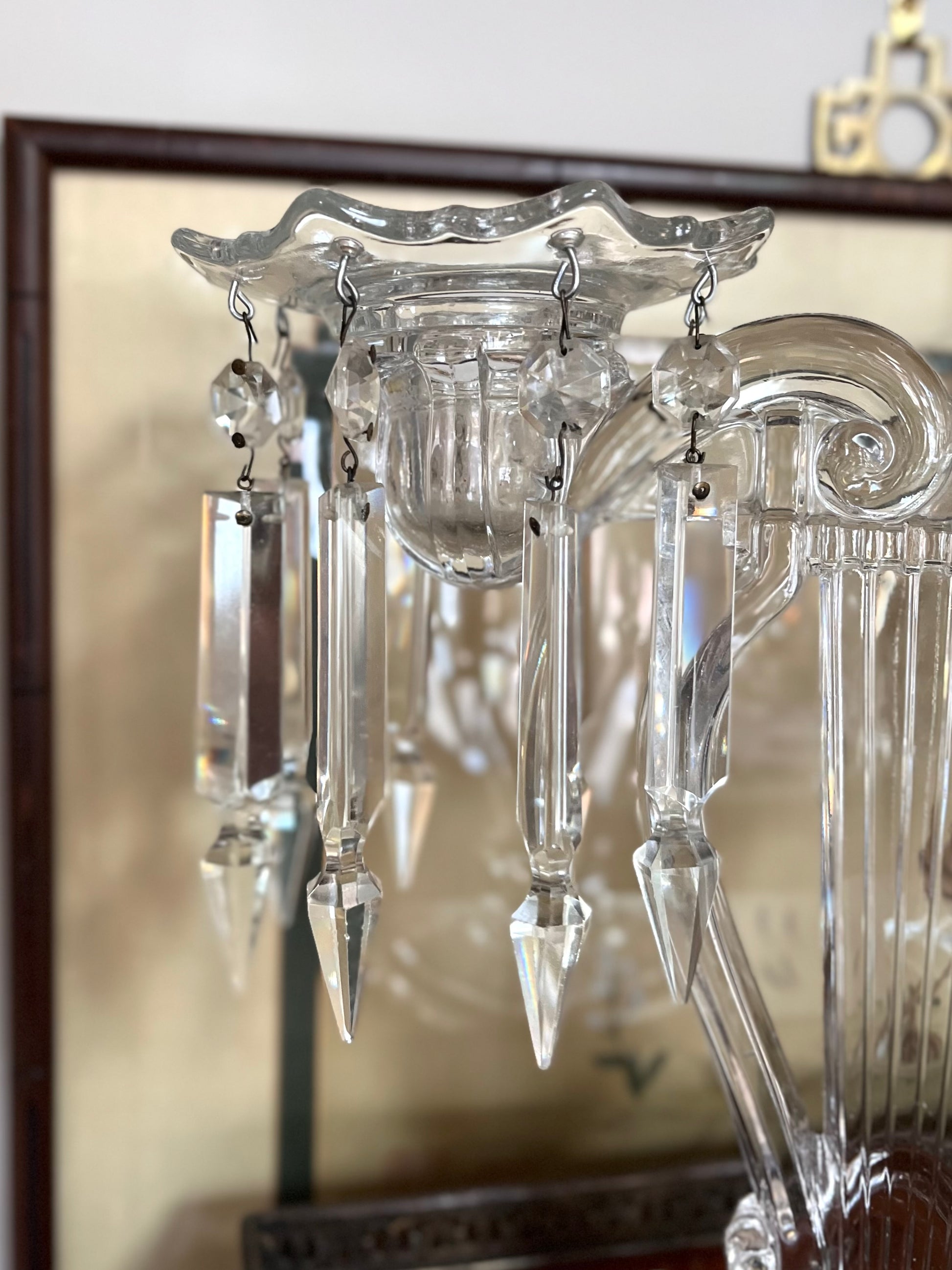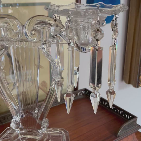 The ultimate combination of elegance and music! Extraordinary Pair Of Cambridge Musical Lyre Shaped 2 Arm Candelabrum! Adorned with stunning drop crystals, these statement pieces will elevate any space and catch the light in a mesmerizing way. Perfect for a music lover or anyone who appreciates these conversation starters. Very impressive and unique. Excellent condition. No chips or cracks. Clear to the eye. These comp for up to 1500.