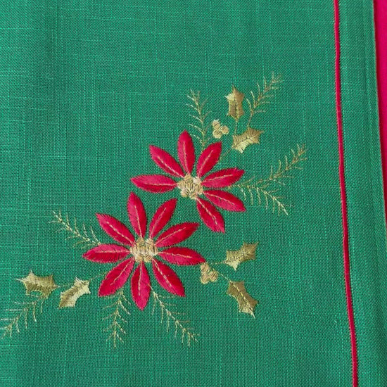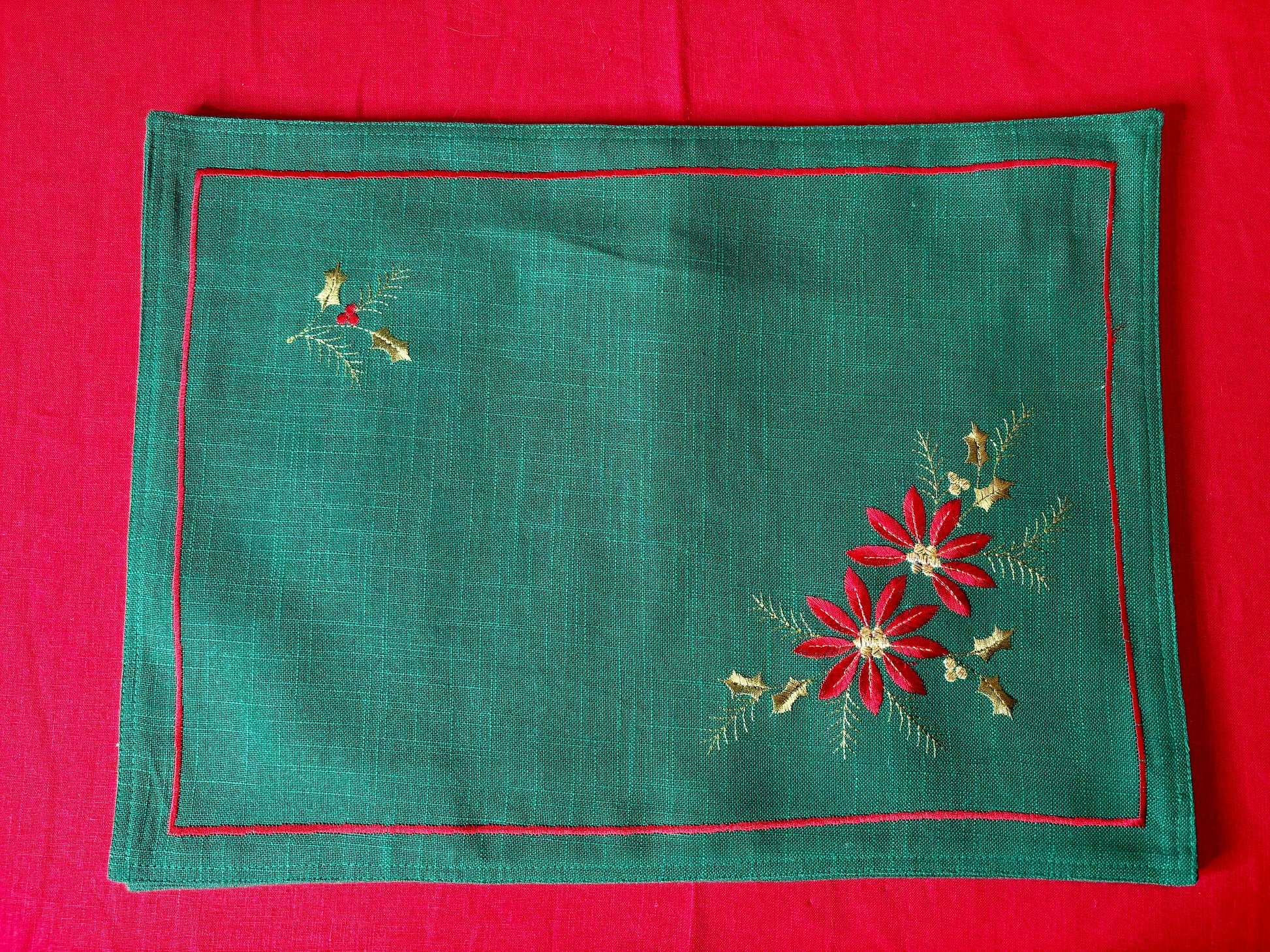 Enhance your holiday table with this set of four green placemats, each measuring 19” x 14” and adorned with beautifully embroidered poinsettia accents.