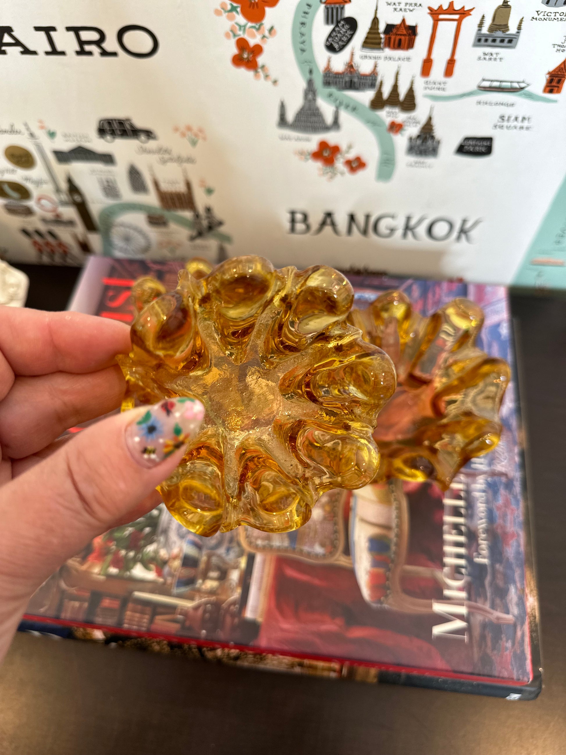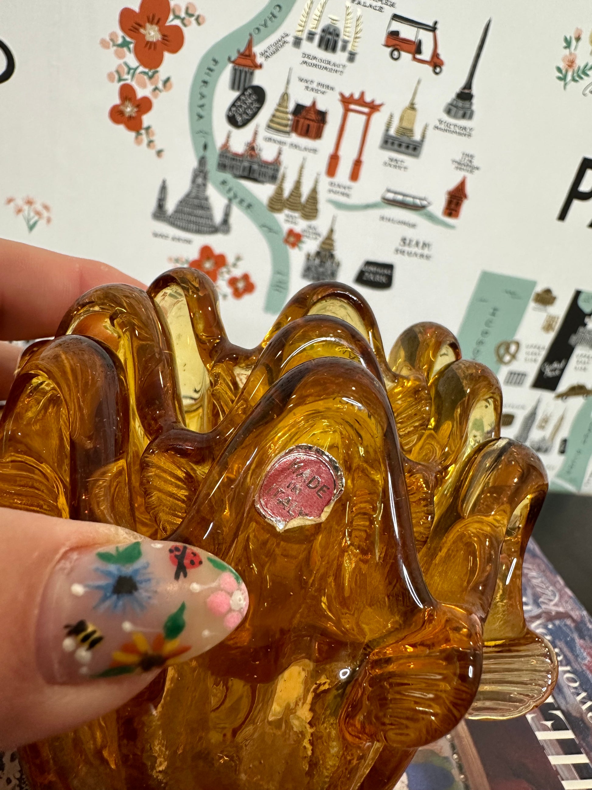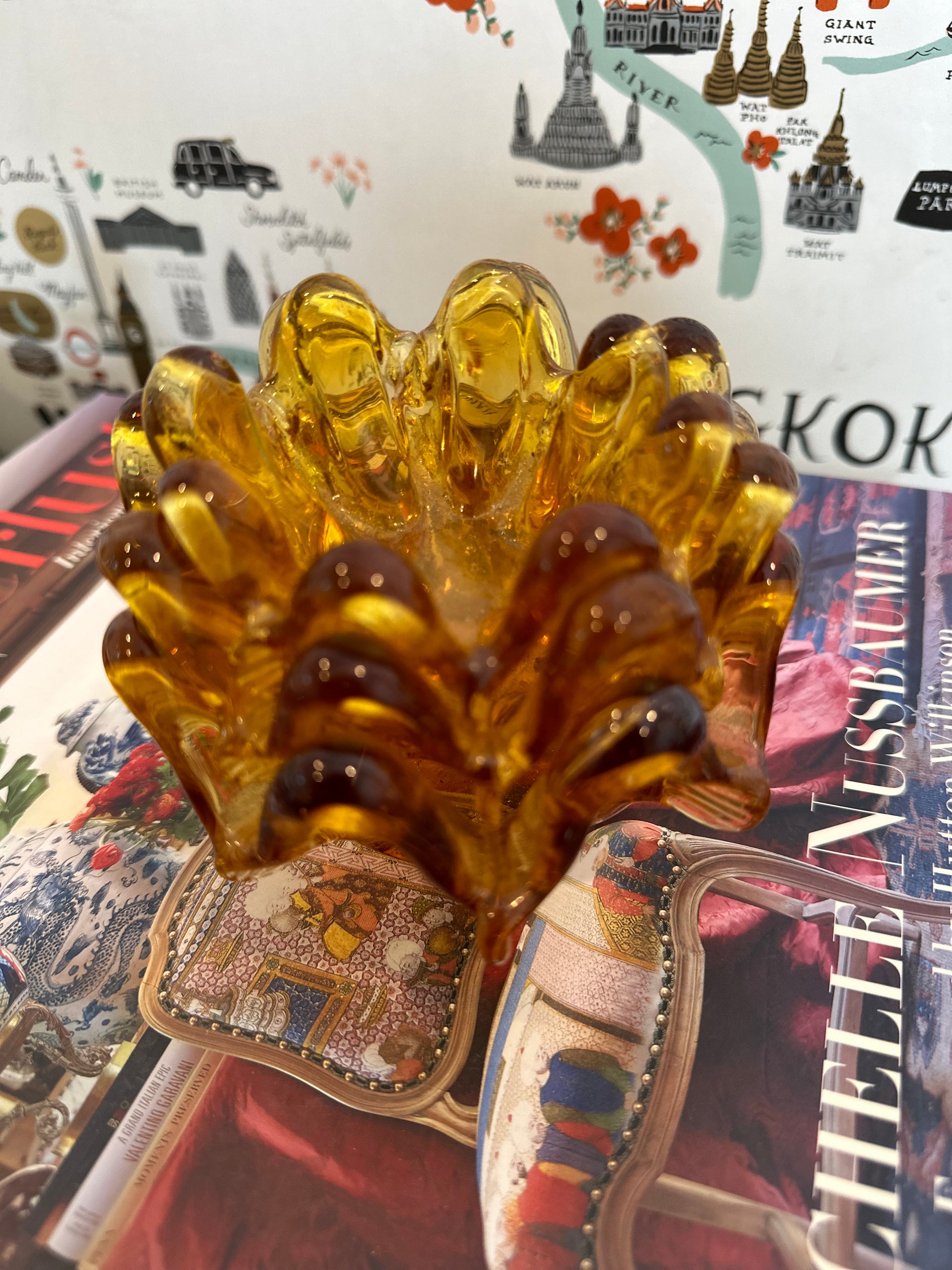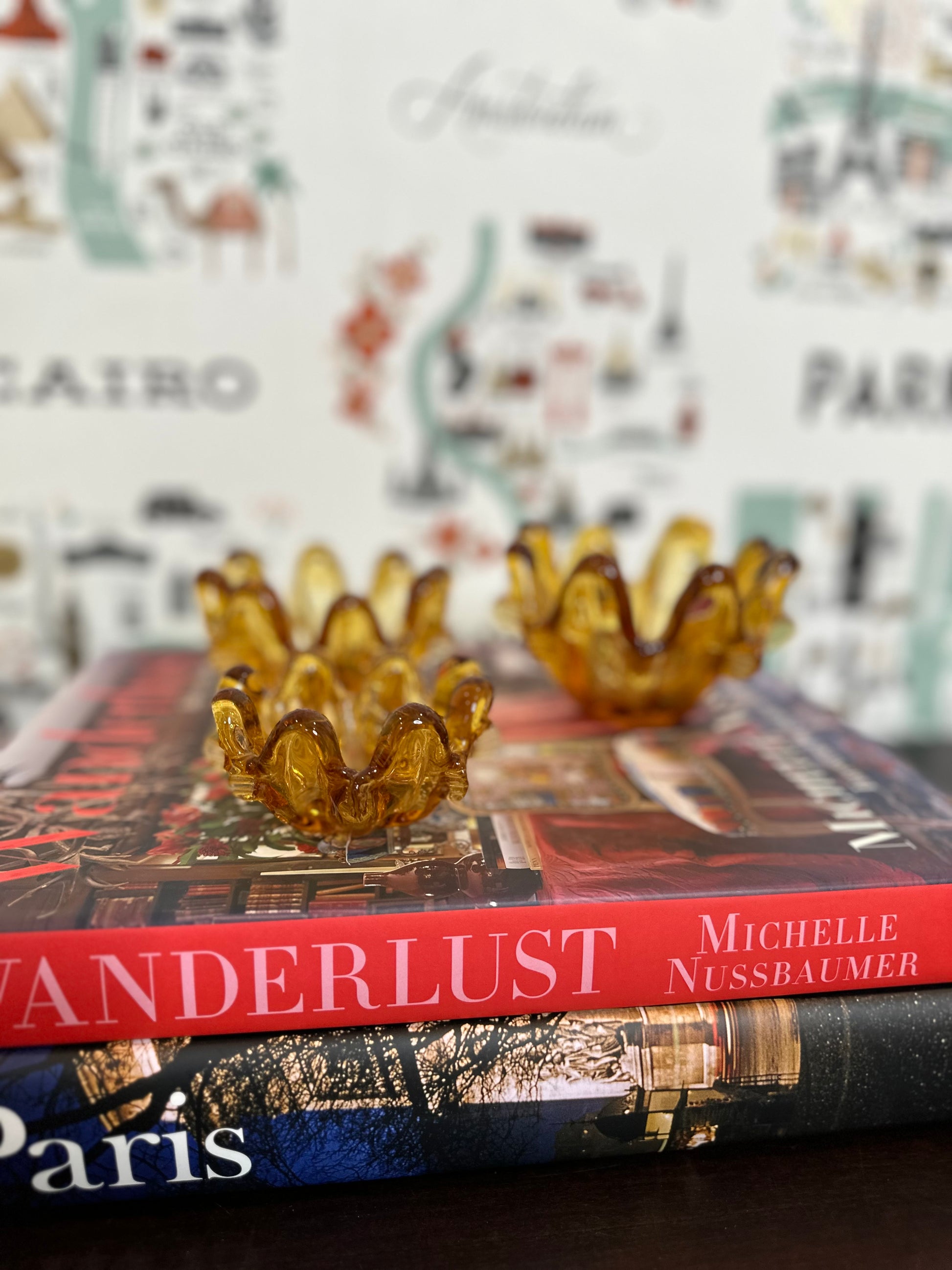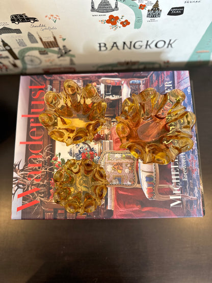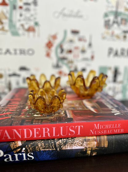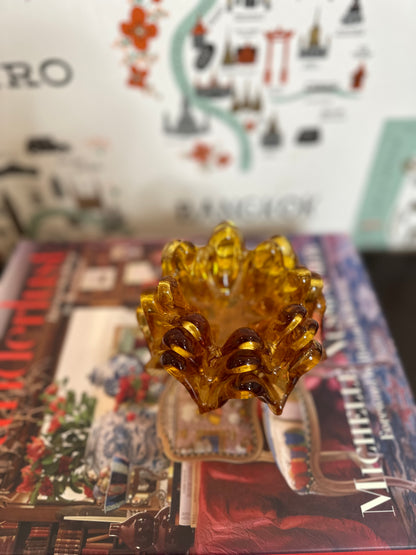 These graduated in size nested votives or bowls are hand blown by master glass blowers in Murano Italy and each one is a beautiful work of art. This set of 3 amber colored glass pieces can be used as candle votives, for candy/snacks or as trinket dishes. They also look great stacked on a set of books or tucked into shelf decor for a touch of fall color. These are in excellent vintage condition, the largest piece still bears the original sticker "made in Italy" and date to the mid 20th century.