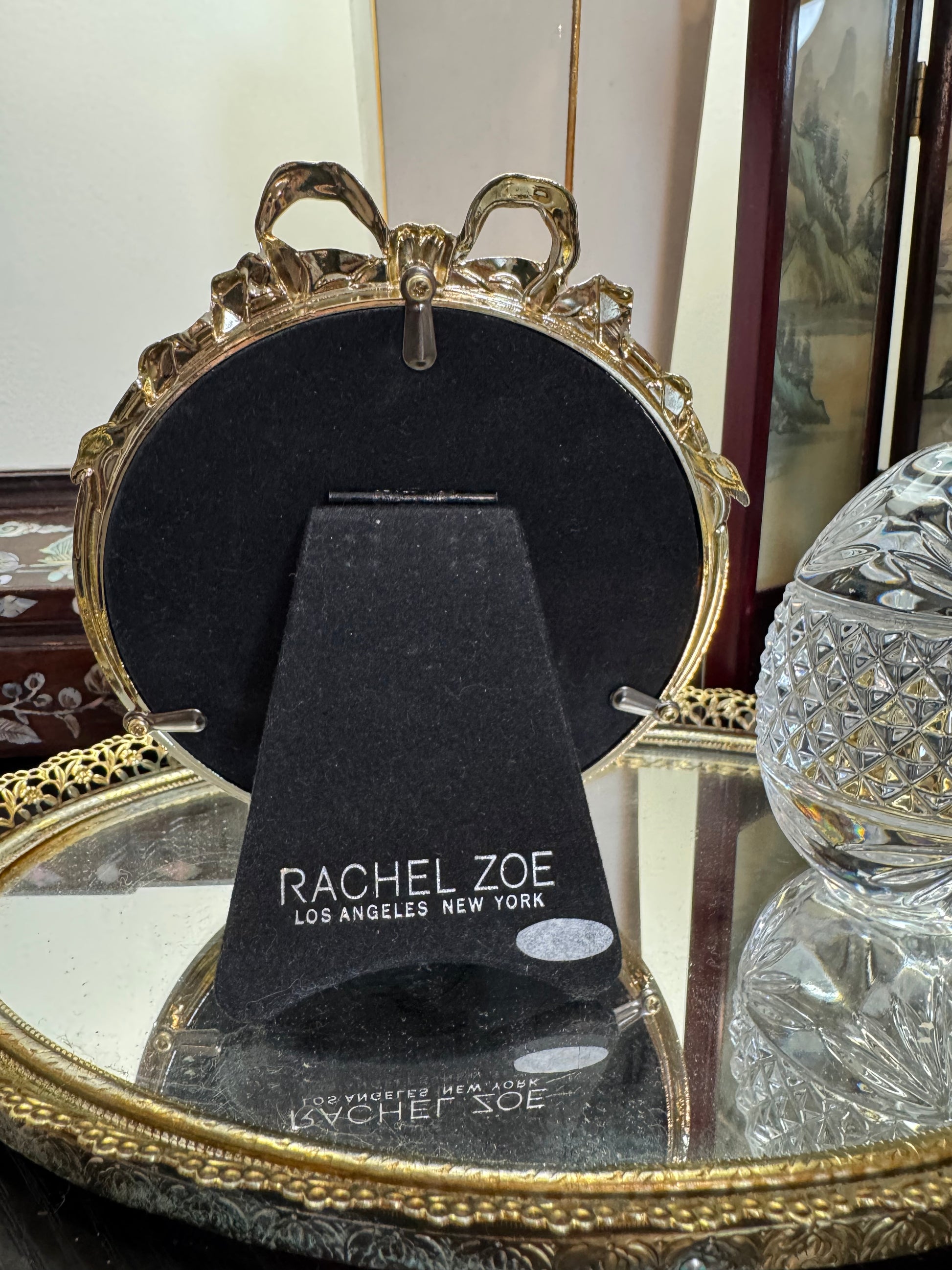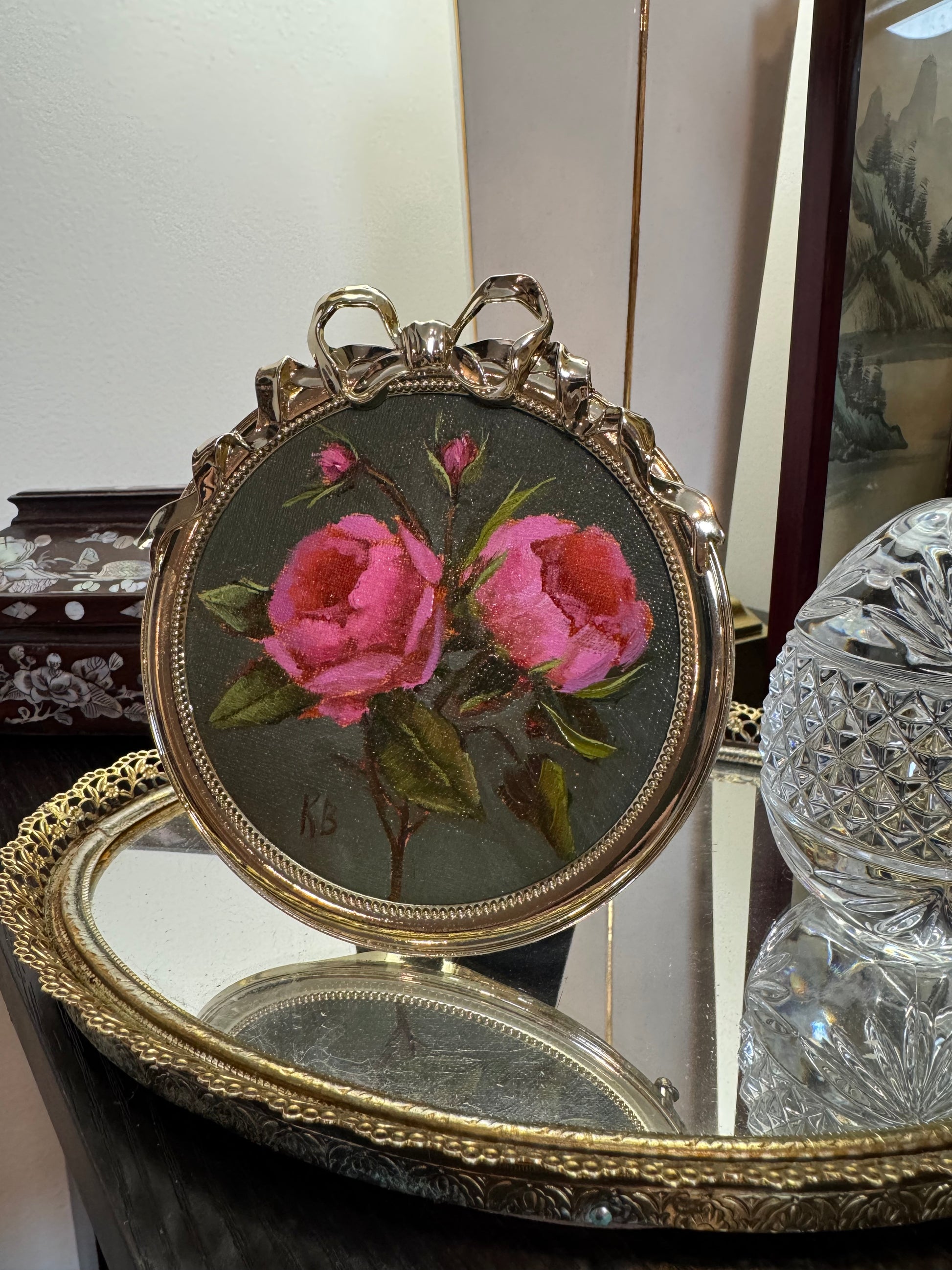 This sweet little painting is created in a beautiful round brass bow frame, which has such an elegant and delicate feel. The frame is new, with a lovely warm tone, and it comes with a kickstand in the back so it’s easy to display on a shelf, desk, or nightstand.